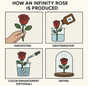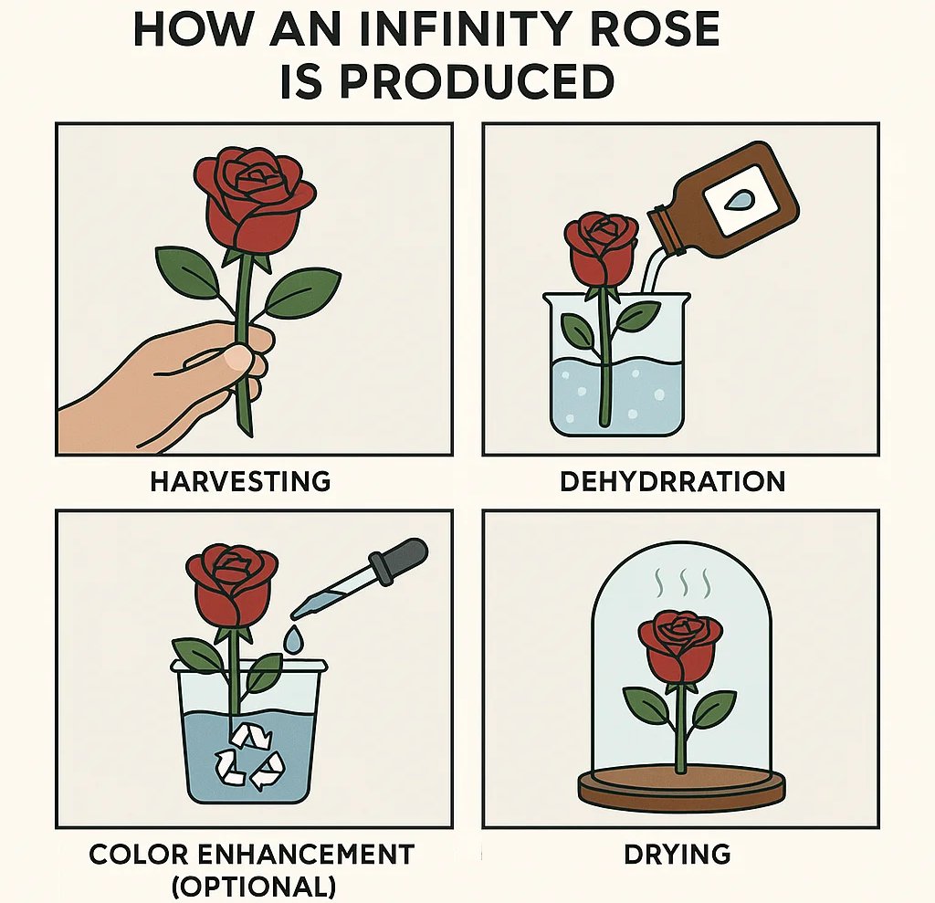 Dehydrierung: Die Rose wird in eine Glycerin-basierte Lösung gelegt, die manchmal mit Alkohol oder anderen Stabilisatoren gemischt ist. Diese Lösung ersetzt den natürlichen Saft und die Feuchtigkeit der Rose, wodurch die Weichheit und Flexibilität der Blütenblätter erhalten bleibt.
